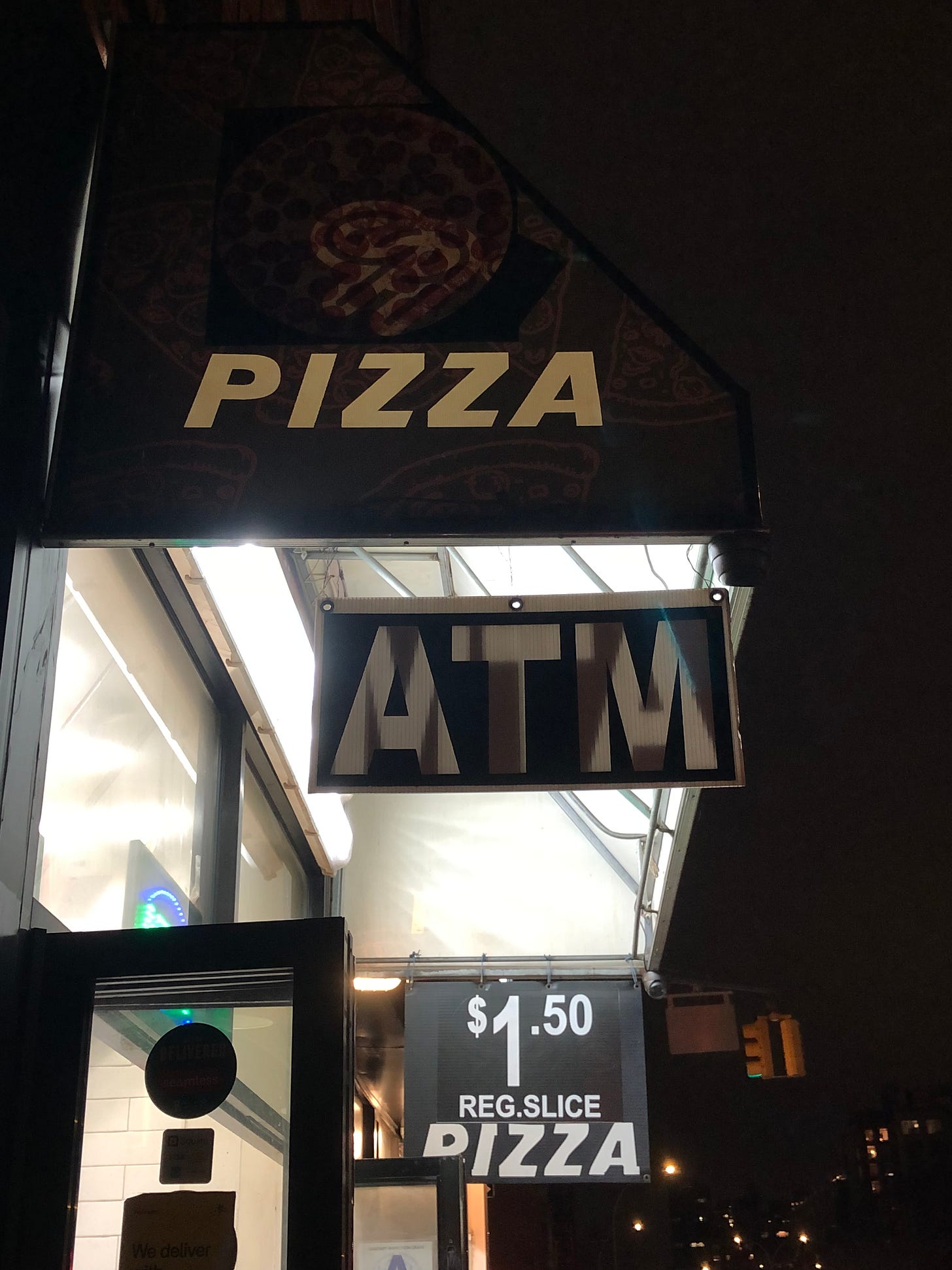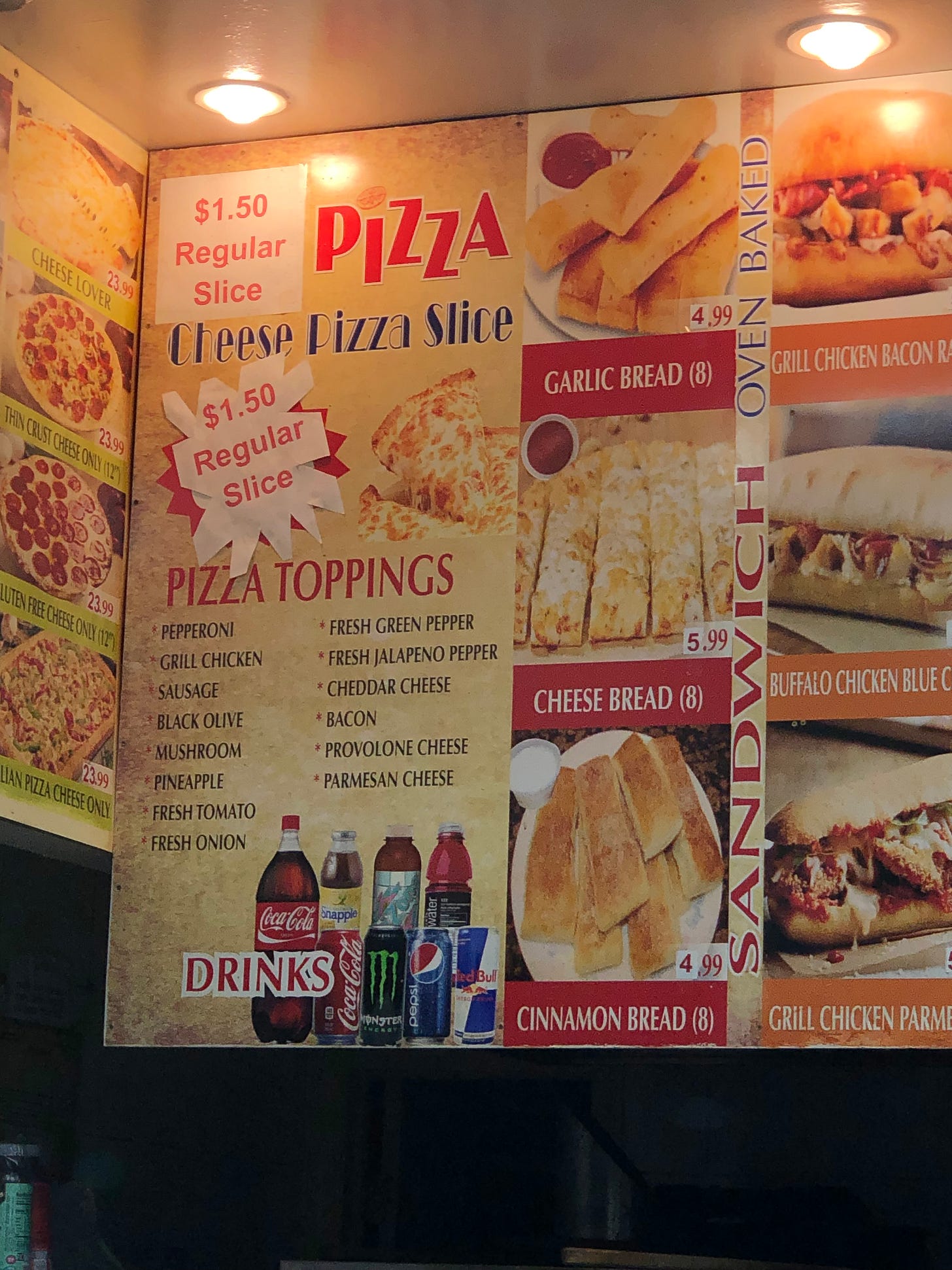 This pizza place employed the "oops, I broke a hole in the drywall and need to cover it with a poster before my parents get home" approach. By sticking a pizza decal over the 99 cents part, they changed the establishment’s name to just "PIZZA." Here's a zoomed out picture, with the new price, of course.