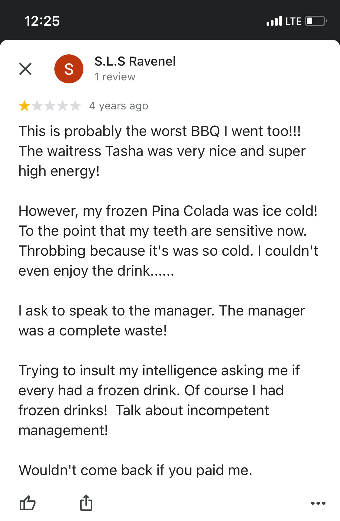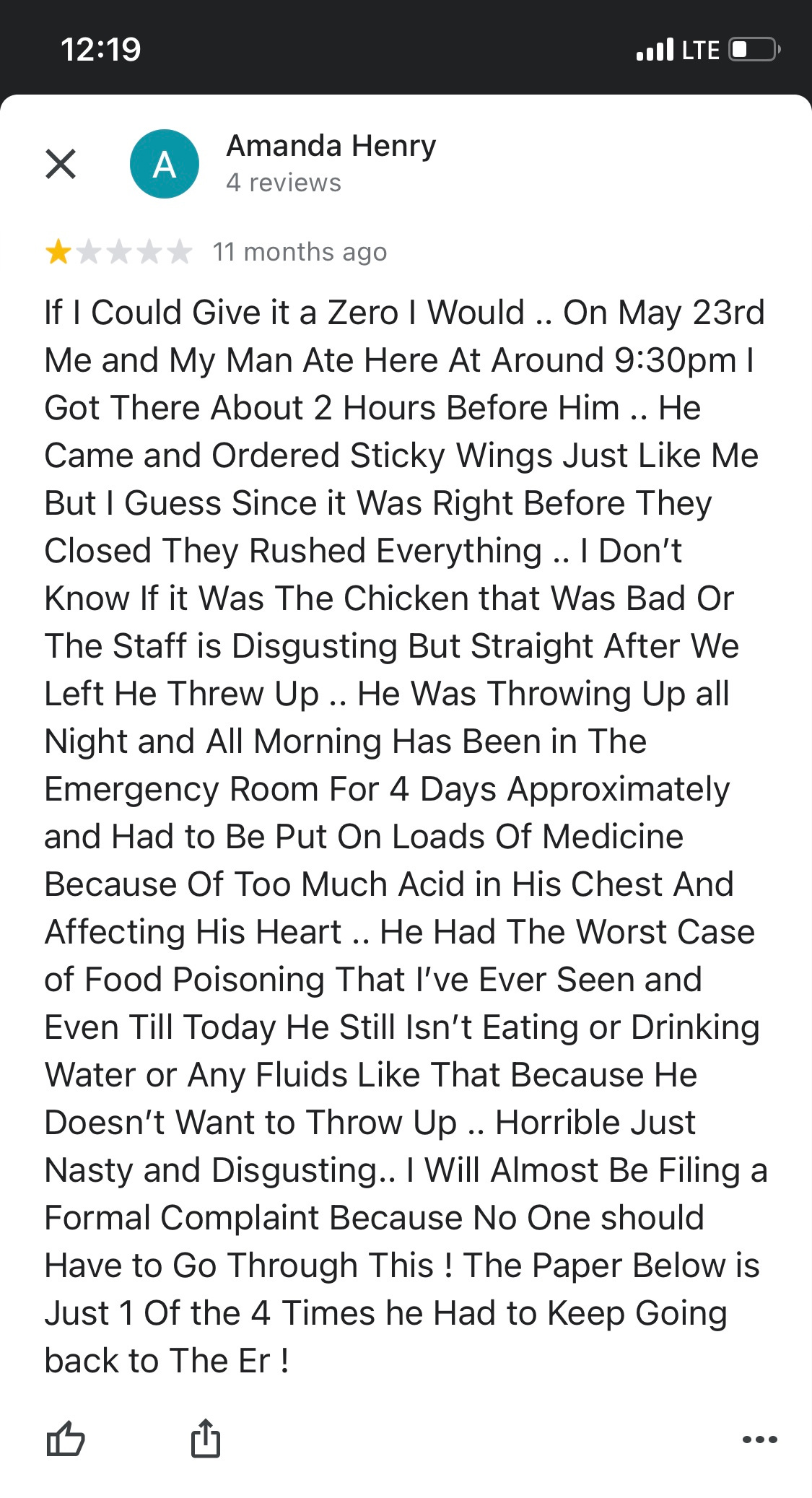 Here we have Amanda Henry, employing Jaden Smith capitalization, describing her man’s bout with food poisoning after eating at Dallas BBQ. I’ve had quite a bit of food poisoning in my lifetime, but none that has landed me in the ER for four days. Dallas BBQ must be doing something truly unique to their wings.