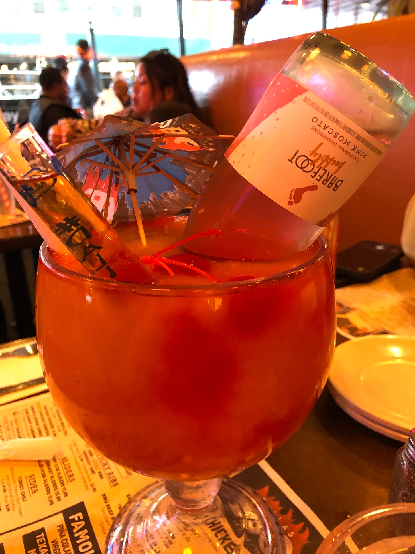 I ordered the Royale Mango Mai Tai. It was a sickly-sweet frozen drink garnished with an overturned bottle of Barefoot Moscato and a test tube of 137 proof rum. I got the Super Texas size for the full experience.
