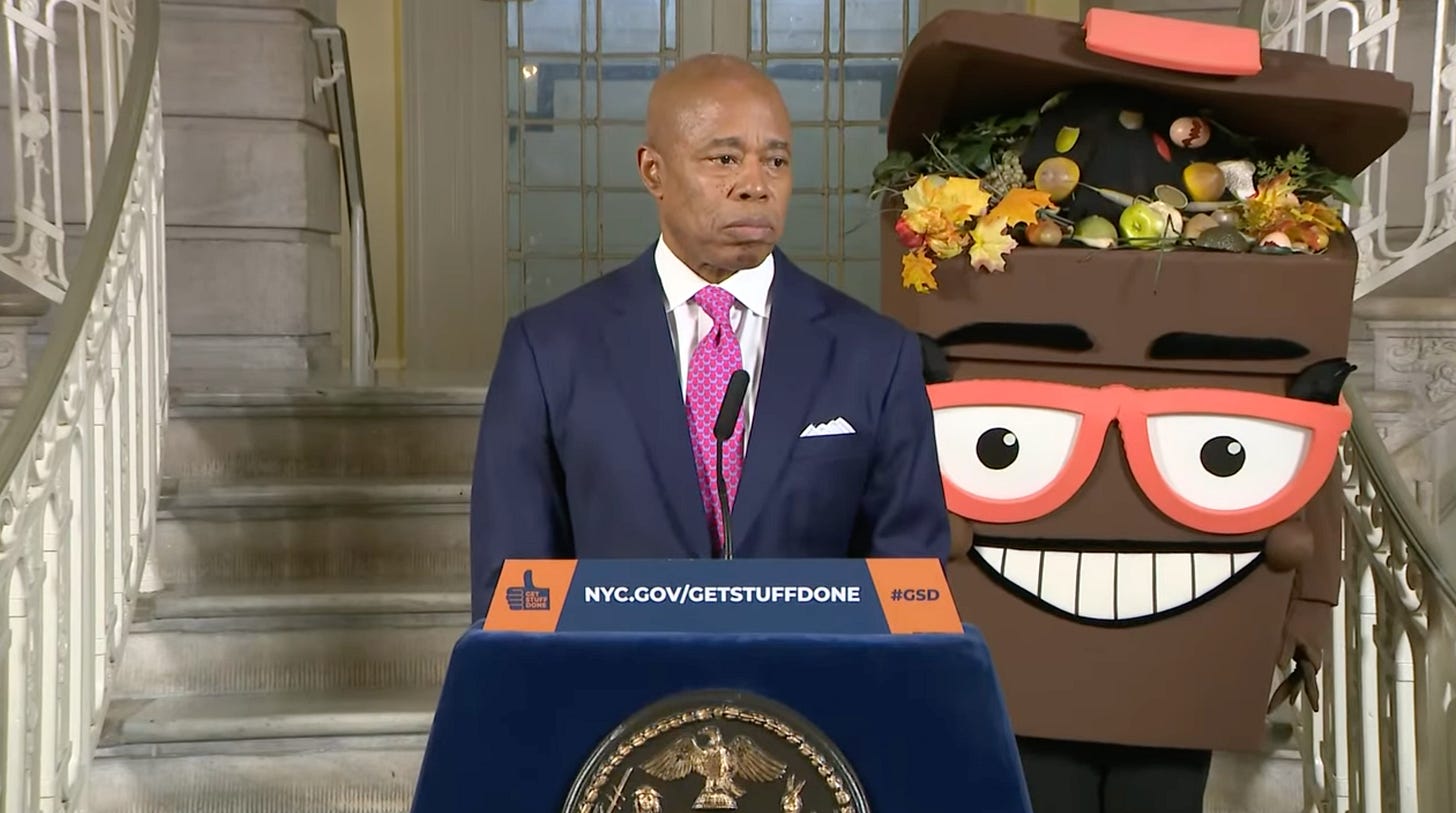 It all started when I saw a video of Mayor Adams announcing a new city-wide composting plan. The plan itself - which is the largest and most comprehensive the city has ever seen - is quite ambitious. It aims to provide compost pickup services to every citizen of New York City, and then dump the compost somewhere nobody will notice, like Staten Island or Newark or something. I’m actually not sure because I was distracted by something in the video: something sinister lurking behind the mayor.