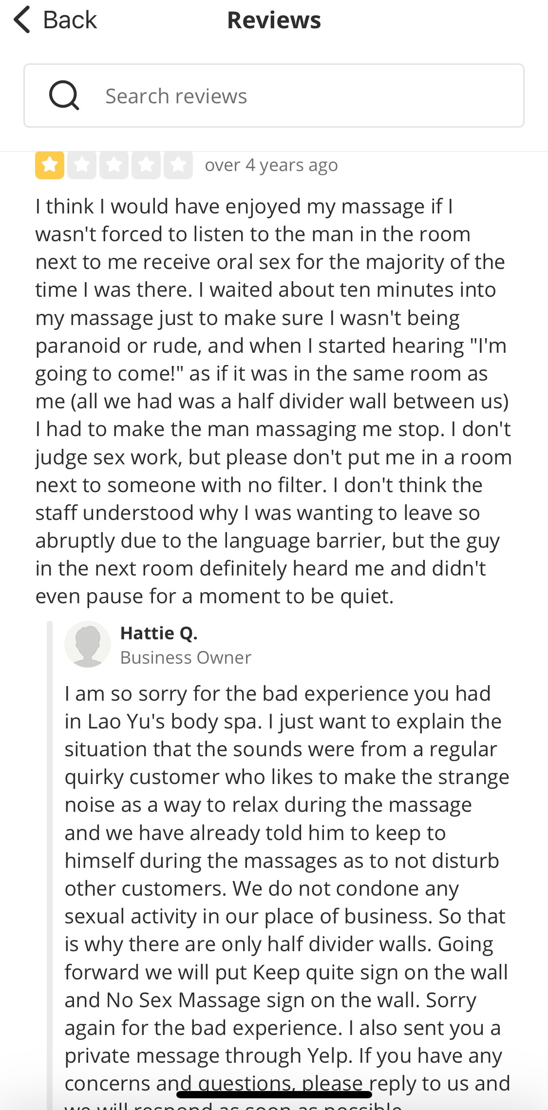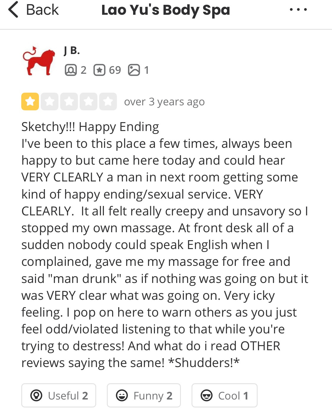 I'm not sure what's more shocking, the review itself or Hattie's insane attempt to explain away the sex noises. A quirky customer just makes those noises as a way to relax during the massage? That’s honestly more alarming than if he had just gotten a happy ending. Imagine getting a massage so good that you scream "I'm going to come!" Even if that was the case, how is that okay? If I walked into a deli, took a bite of a really good sandwich, and announced to the entire establishment that I was climaxing they would probably ask me to leave.