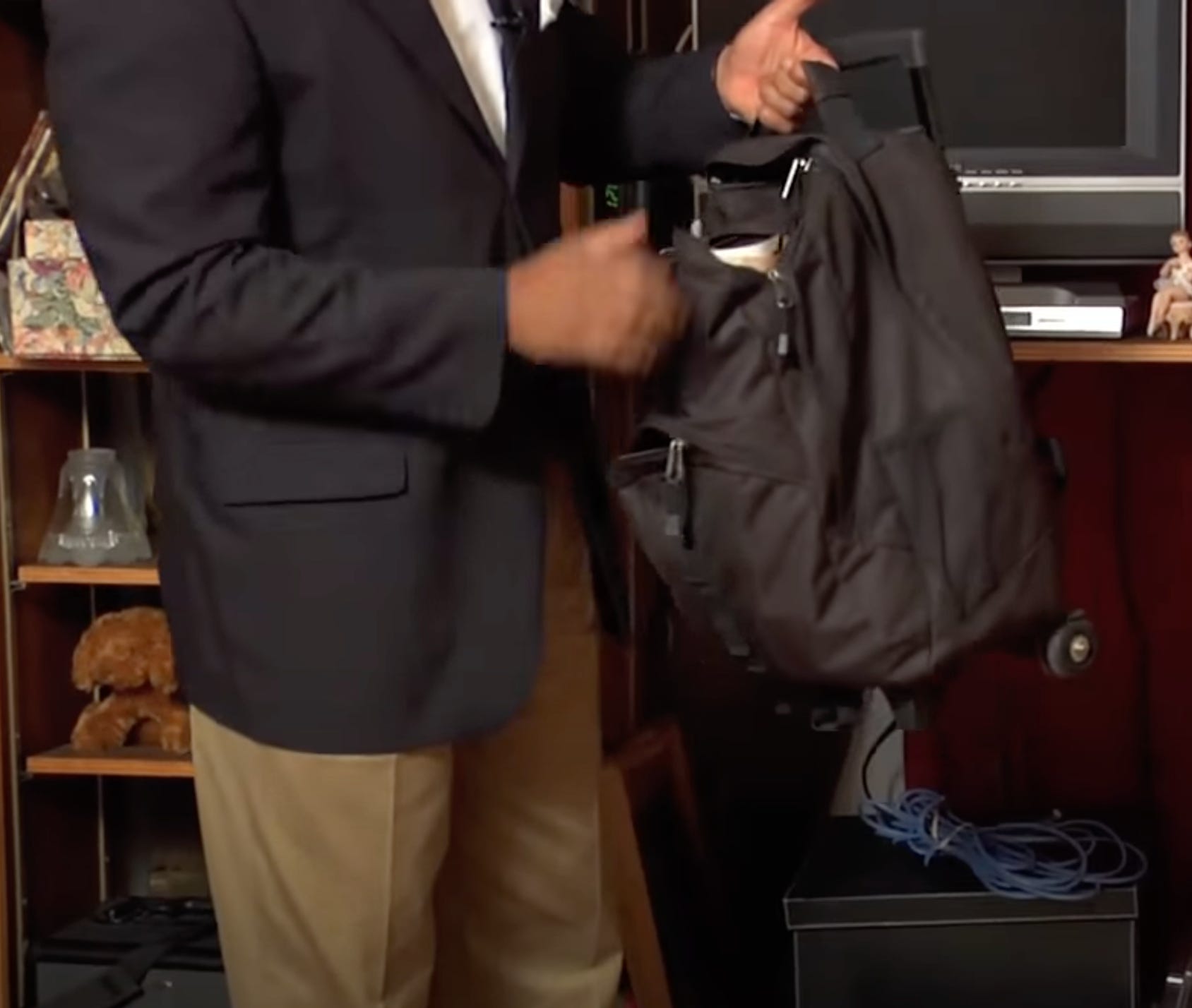 My favorite part is when he holds up a roller-backpack and calls it a "popular knapsack," then reveals that a used crack pipe is hidden inside which should prompt the parent to start a conversation with the child.