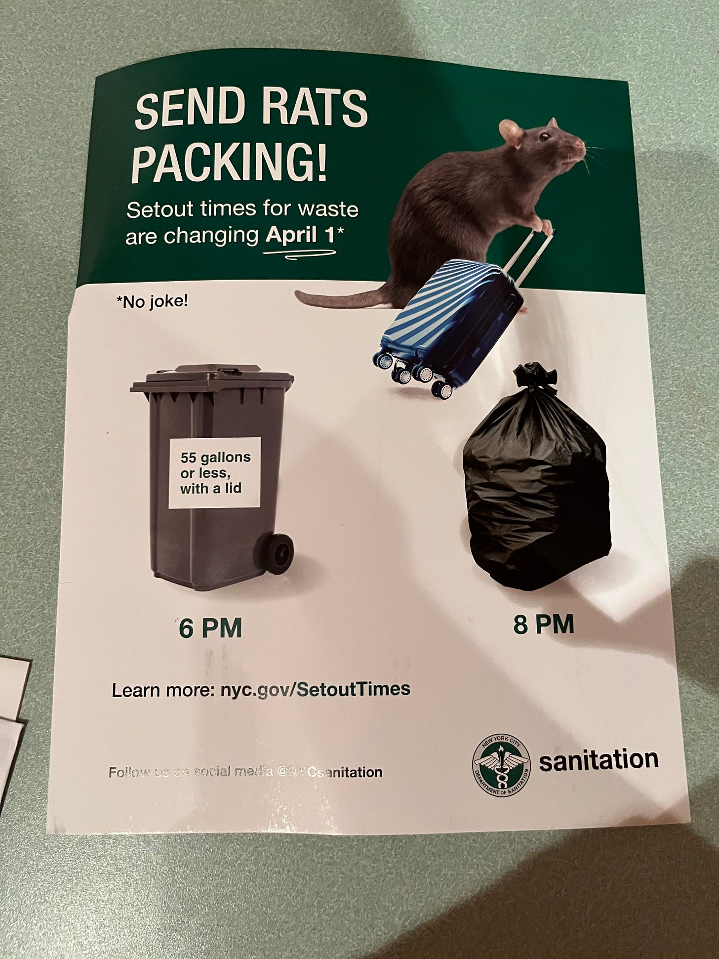 “I’m honored to lead this work, grateful to Mayor Adams for this opportunity, and look forward to sending the rats packing,” she said, referencing the flier circulated by the city depicting a rat with a cute lil suitcase.