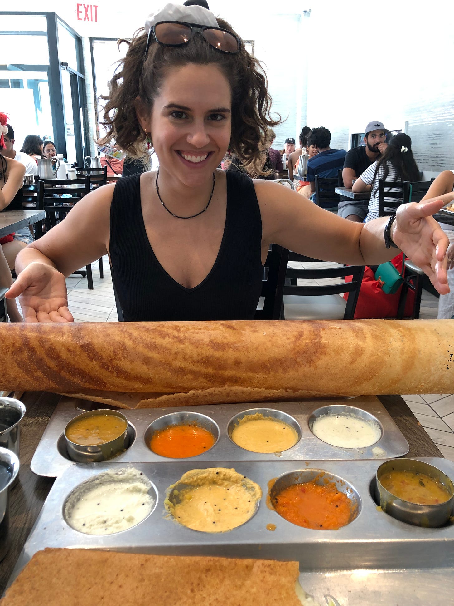 All these details aside, the food here is amazing. Saravanaa Bhavan serves dosas, which are like crispy Indian pancakes made from lentils and rice. Sometimes it comes with stuff inside like cheese and potatoes.