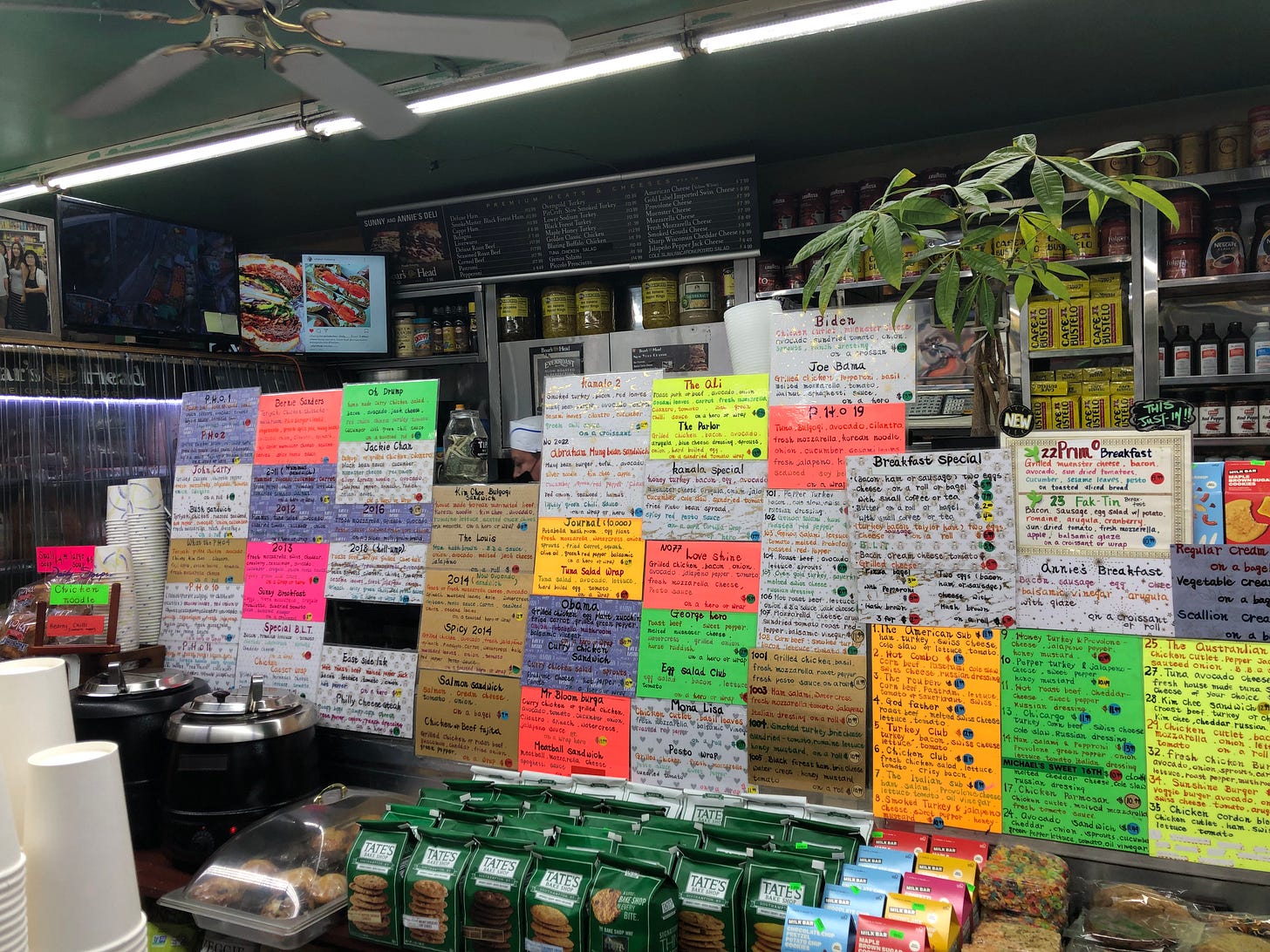 Sunny & Annie’s Deli is a bodega on Avenue B, and is more like a tiny convenience store than a deli. You walk into a cramped space where people congregate around an enormous wall of handwritten menus made of construction paper which describe dozens of types of sandwiches. A hat, barely visible above the menu wall, floats back and forth behind the menus. That’s the sandwich man.