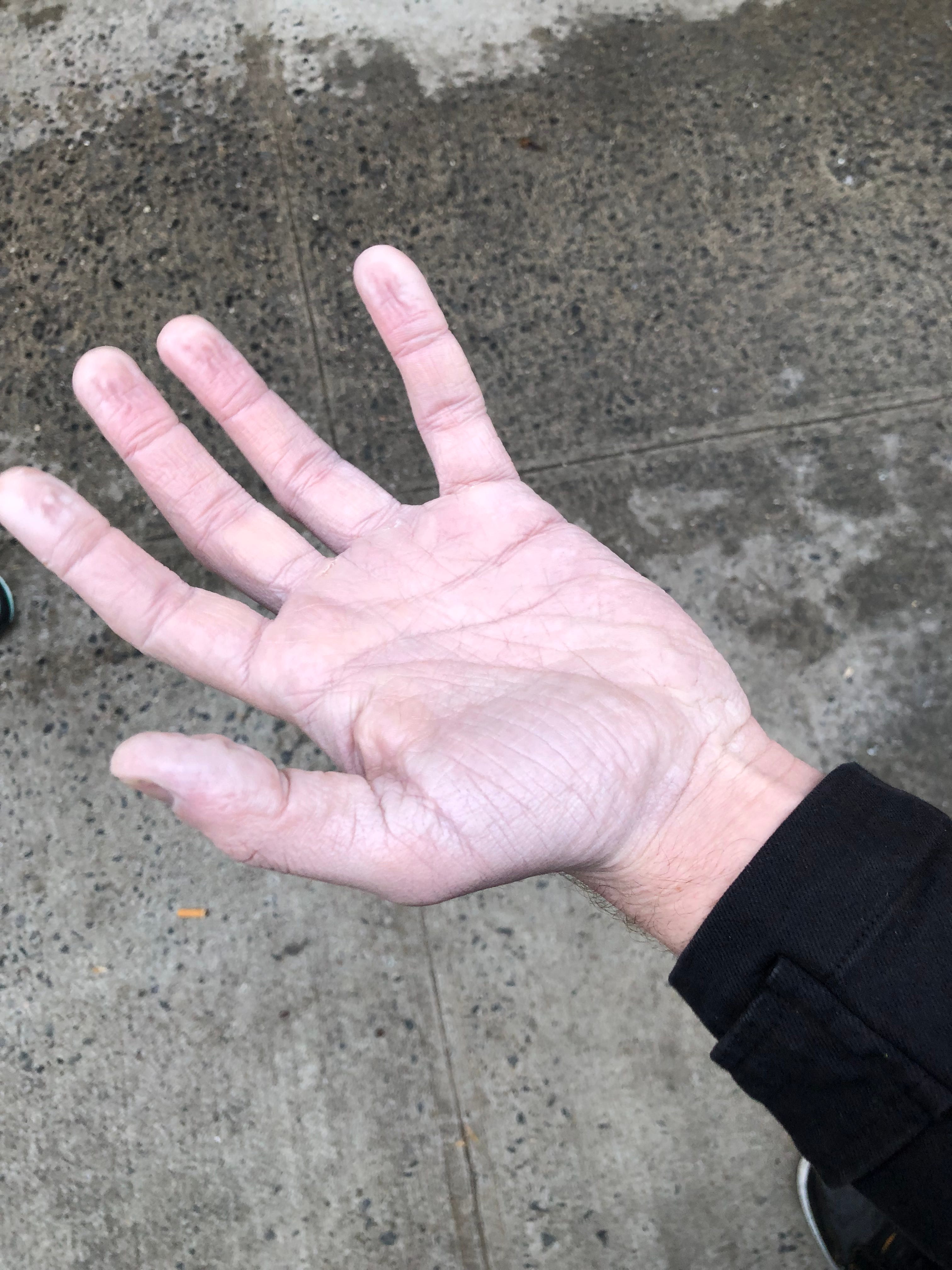The most alarming part of the visit was that my friend seemed to have contracted a case of "corpse hand," which is a disease I just made up to describe when your hands look like a dead man's hands.
