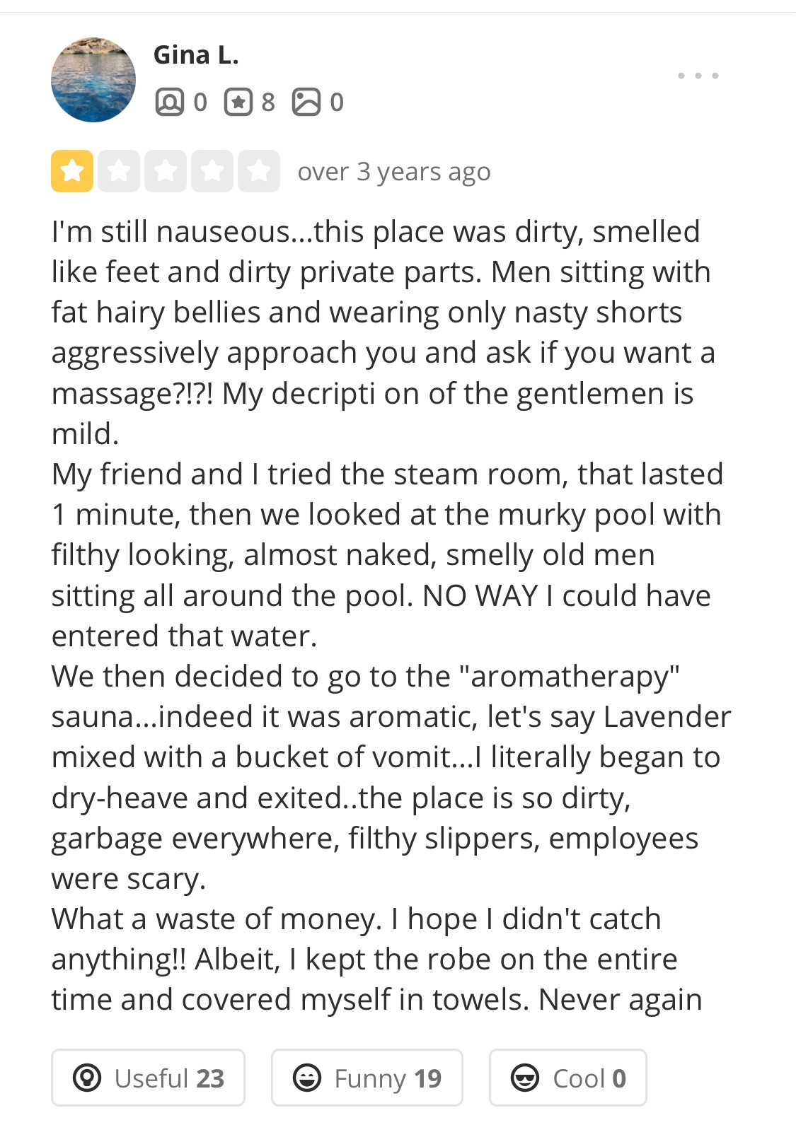To Gina's credit, the sauna did indeed smell like dirty old private parts. To cover up the smell of old private parts they periodically pump eucalyptus(?) oil into the sauna, which masks the smell but is so strong that it burns your eyes and nostrils like tear gas.