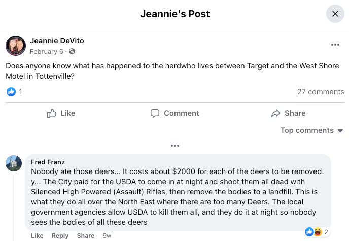 There’s even a Facebook group called Deer Across Staten Island where the same five or six people upload pictures of the deer they see.