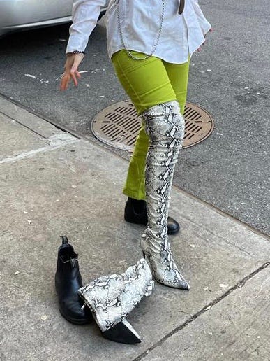 Eventually my friend walked away from the chaos with a corset, the prized trench coat, and these boots that make it look like boa constrictors have begun devouring each or her legs separately.